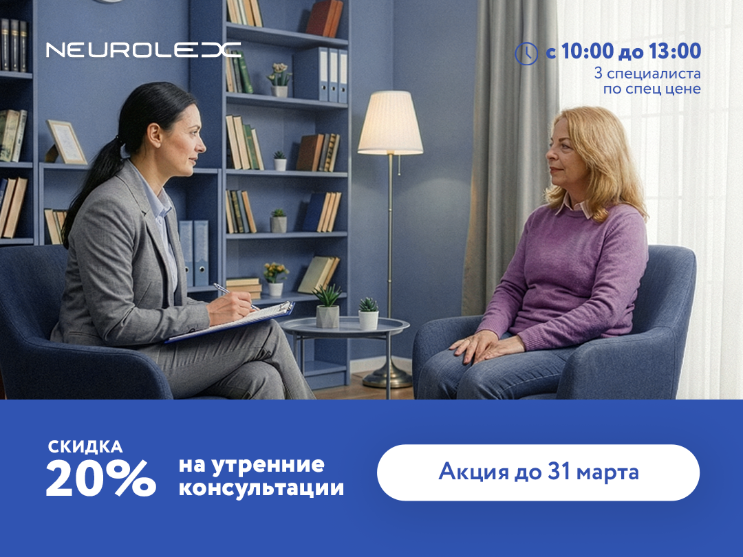 Начните свой день с заботы о самом важном – о своём психологическом благополучии. Запишитесь на приём на время с 10:00 до 13:00 и получите скидку 20%.